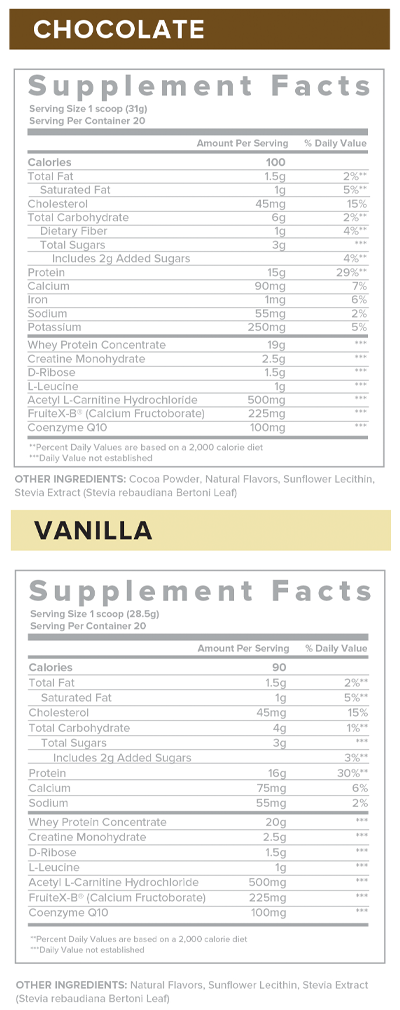 RECOVER is an innovative post-workout supplement designed to help shorten your recovery time and maximize results. RECOVER is formulated with a host of nutrients intended to help you recover and build, from high-quality Whey Protein for recovery, Leucine and Creatine for muscle growth, powerful antioxidant CO-Q10, energy-boosting Ribose and Carnitine, and Fruitex-B® for joint support.