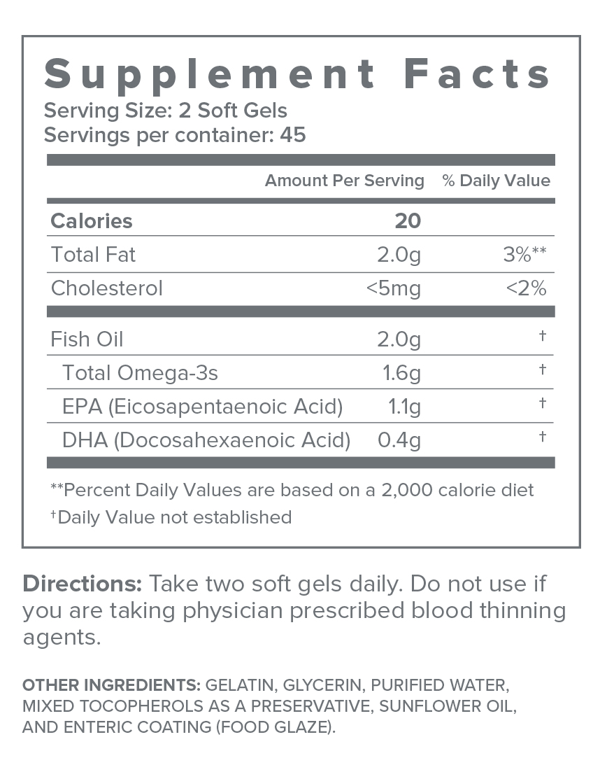 All the goodness of our fish oil in an easy-to-swallow gel capsule form. Two of these soft gels contain 1.5 grams of pure EPA/DHA.